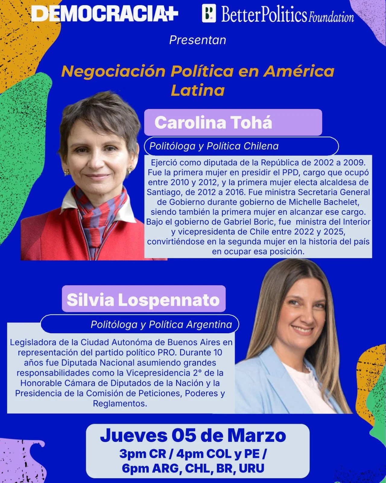 En el marco del Día Internacional de las Mujeres, Democracia+, Better Politics Foundation y Más para Chile realizaron un conversatorio junto a Carolina Tohá (Chile) y Silvia Lospennato (Argentina) para reflexionar sobre cómo se construyen acuerdos y mayorías en contextos complejos, y sobre el papel que están cumpliendo las mujeres en la transformación de la política en América Latina.